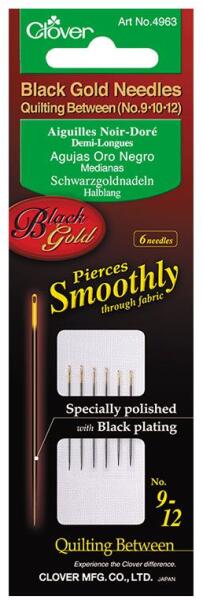Clover black gold vagyis fekete-arany flexibilis, félhosszú, quilting tűkészlet, 3 méretben. A készletben hat tű található 3 méretben: - 2 db, no. 9,   0,53x27mm